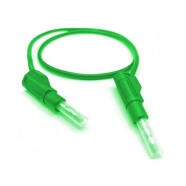 Złącza wyposażone są w izolowane wtyki bananowe 4 mm z obu stron, posiadające gniazda osiowe 4 mm oraz suwane osłony. Izolację przewodu wykonano z trwałego materiału PVC, który zapewnia odpowiednią elastyczność i ochronę przewodu. Element dostępny jest w kolorze zielonym, co ułatwia identyfikację torów pomiarowych w złożonych instalacjach.