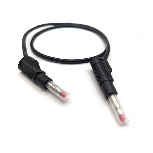 Zewnętrzna powłoka przewodu wykonana jest z izolacji typu PVC w kolorze czarnym. Element zapewnia zgodność z normą bezpieczeństwa CAT II 600 V, co określa zakres jego dopuszczalnego użytkowania w obwodach elektrycznych. Produkt jest gotowy do użycia w zestawach pomiarowych wymagających wysokiej obciążalności prądowej i standardowych połączeń typu banan.