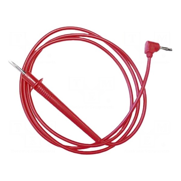 Przewód pomiarowy o prądzie znamionowym 10 A przeznaczony jest do wykonywania połączeń w układach pomiarowych przy napięciu roboczym do 0,6 kV. Konstrukcja elementu obejmuje końcówkę pomiarową oraz kątowy wtyk bananowy o średnicy 4 mm.