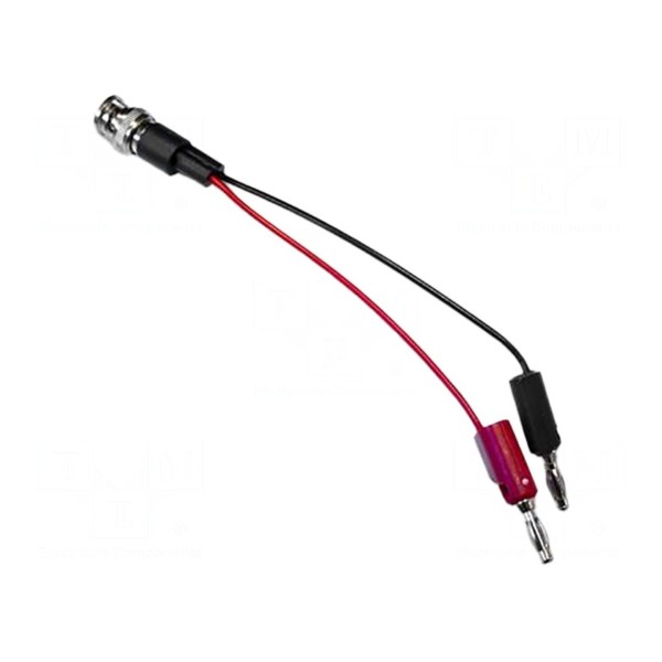 Przewód pomiarowy charakteryzuje się konstrukcją złączową typu wtyk BNC oraz dwoma wtykami bananowymi 4 mm. Komponent został zaprojektowany do pracy przy napięciu znamionowym 0,3 kV (300 V).