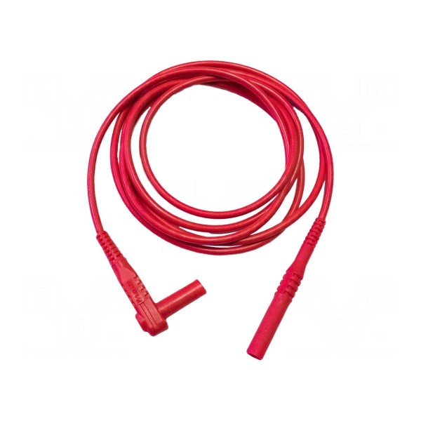 Przewód pomiarowy marki Mueller Electric o długości 0,61 m został zaprojektowany do pracy pod napięciem znamionowym 1 kV oraz przy prądzie znamionowym 20 A. Wyposażony jest w izolowane wtyki bananowe 4 mm, w tym jeden wtyk kątowy, co zapewnia odpowiednią współpracę z gniazdami pomiarowymi. Kolor przewodu to czerwony.