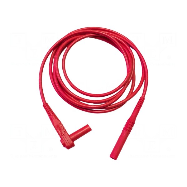Przewód pomiarowy o długości 1m wyposażony w izolowane wtyki bananowe 4mm. Konstrukcja złącza obejmuje wtyk prosty oraz wtyk kątowy, co umożliwia wygodne podłączenie w różnych konfiguracjach pomiarowych. Przewód w kolorze czerwonym został wykonany z materiału izolacyjnego typu silikon, który charakteryzuje się odpornością na temperatury w zakresie od -40 do 80°C.