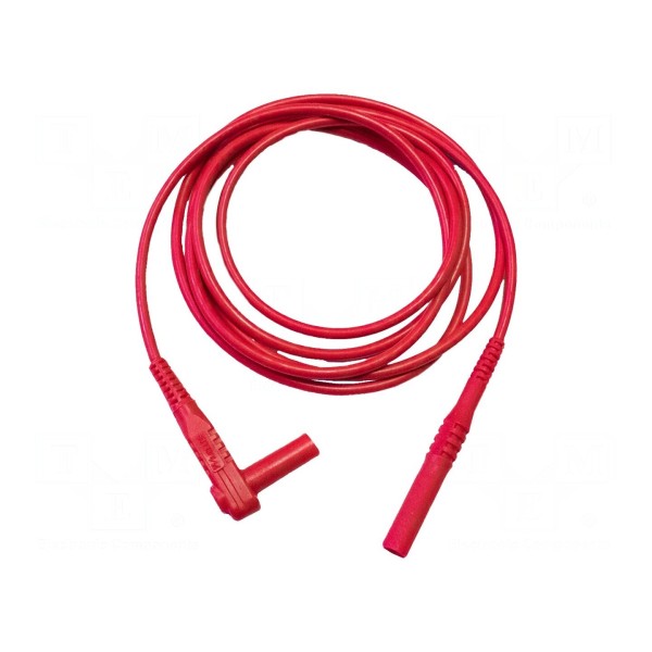 Przewód pomiarowy o długości 1,8 metra przystosowany jest do pracy z prądem znamionowym o natężeniu 20A oraz napięciem znamionowym 1kV. Konstrukcja elementu obejmuje wtyk bananowy 4mm oraz wtyk bananowy kątowy 4mm, które posiadają izolowane złącza dla poprawy bezpieczeństwa użytkowania. Kolor izolacji przewodu to czerwony.