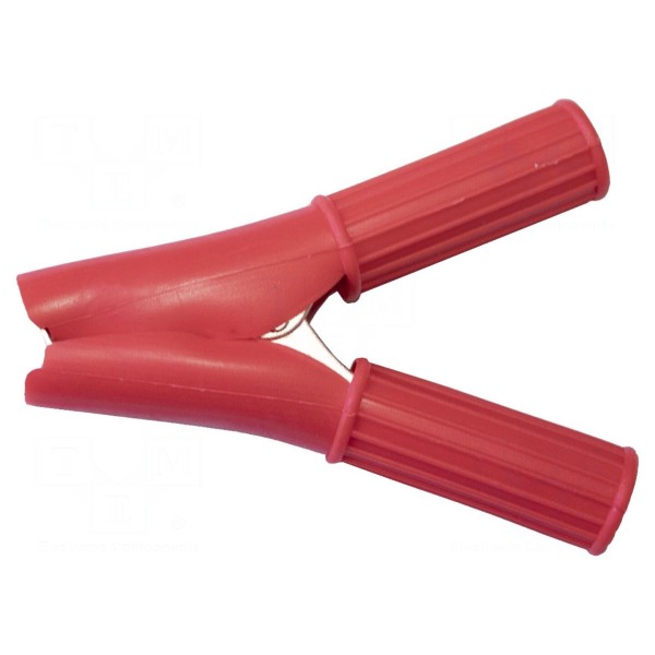 Zacisk krokodylkowy o prądzie znamionowym 50A przeznaczony jest do wykonywania połączeń elektrycznych. Produkt posiada zakres chwytania wynoszący maksymalnie 29mm oraz całkowitą długość 79mm. Element wyróżnia się czerwoną izolacją obudowy.