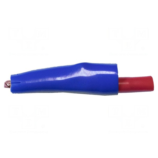 Konstrukcja zacisku została wykonana z miedzi, co zapewnia odpowiednią przewodność elektryczną. Urządzenie wyposażone jest w gniazdo o rozmiarze 4 mm oraz posiada całkowitą długość 58 mm. Produkt utrzymany jest w kolorze niebieskim.