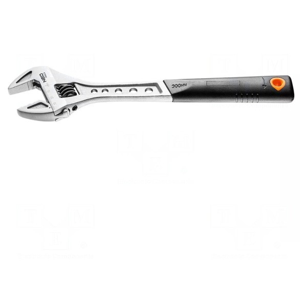 Klucz nastawny marki NEO TOOLS o długości całkowitej 300 mm umożliwia regulację rozwarcia szczęk do 38 mm. Narzędzie zostało wykonane ze stali chromowo-wanadowej, co zapewnia parametry wytrzymałościowe konstrukcji.
