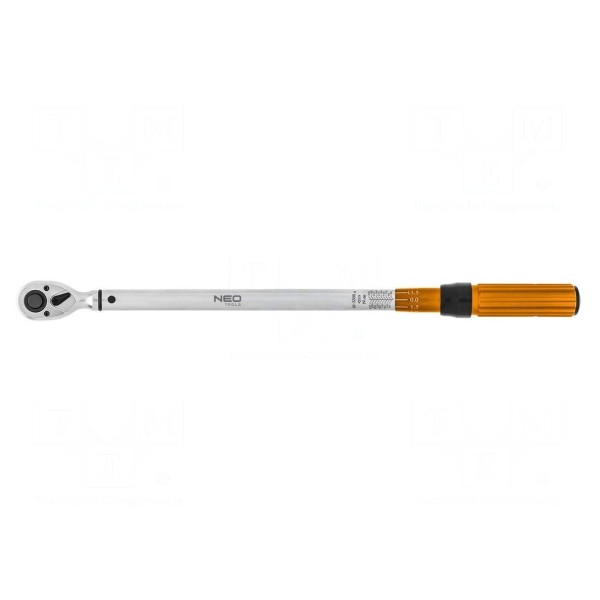 Narzędzie wyposażone jest w uchwyt typu kwadrat o rozmiarze 1/2". Całkowita długość klucza wynosi 570 mm, co zapewnia odpowiednią dźwignię podczas pracy. Konstrukcja umożliwia precyzyjne ustawienie siły dokręcania, co jest kluczowe w pracach mechanicznych wymagających zachowania konkretnych parametrów montażowych.