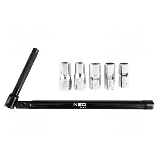 W skład zestawu wchodzi komplet 5 elementów o profilu 6-kątnym. Narzędzia przeznaczone są do prac montażowych i serwisowych wymagających użycia kluczy nasadowych z przegubem.