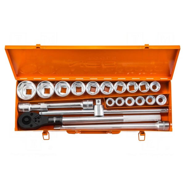 Zestaw zawiera 21 narzędzi przeznaczonych do prac mechanicznych wymagających obsługi elementów złącznych o dużych rozmiarach. W skład kompletu wchodzą nasadki 6-kątne oraz grzechotka z gniazdem uchwytu o rozmiarze 3/4".