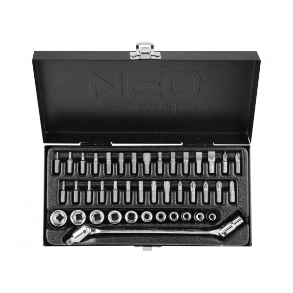 Zestaw zawiera klucze nasadowe 6-kątne z uchwytem o rozmiarze 1/4". Komplet składa się z 41 elementów przeznaczonych do prac montażowych i serwisowych.