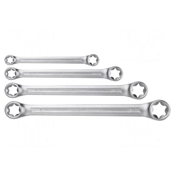 Zestaw kluczy oczkowych typu Torx składa się z 4 sztuk narzędzi wykonanych ze stali chromowo-wanadowej. Konstrukcja narzędzi zapewnia trwałość podczas pracy z połączeniami śrubowymi.
