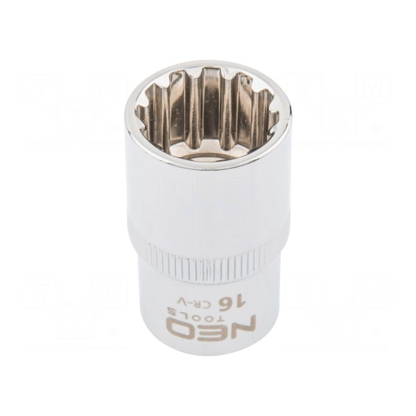 Nasadka spline 12-kątna o rozmiarze 16 mm przeznaczona jest do współpracy z narzędziami wyposażonymi w zabierak 1/2". Całkowita długość elementu wynosi 38 mm.