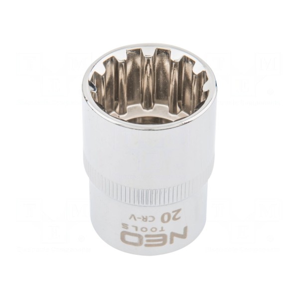 Nasadka spline o rozmiarze 20mm przeznaczona jest do współpracy z kluczami wyposażonymi w trzpień 1/2". Dzięki 12-kątnemu profilowi roboczemu umożliwia pracę z nakrętkami i śrubami sześciokątnymi oraz wielowypustowymi.