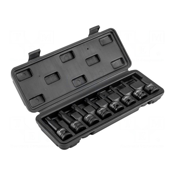 Zestaw nasadek udarowych typu Torx, przeznaczonych do pracy z kluczami udarowymi. Komplet zawiera osiem elementów w rozmiarach TX30, TX40, TX45, TX50, TX55, TX60, TX70 oraz TX80.