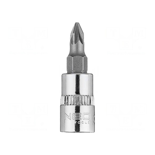 Nasadka narzędziowa typu Pozidriv o rozmiarze PZ1 wyposażona jest w uchwyt o średnicy 1/4". Element charakteryzuje się krótką konstrukcją o całkowitej długości wynoszącej 37 mm.