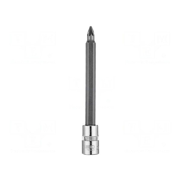 Produkt wykonany został ze stali chromowo-wanadowej. Wersja długa nasadki zapewnia stabilne osadzenie w gnieździe i efektywną pracę z elementami złącznymi o profilu PZ.