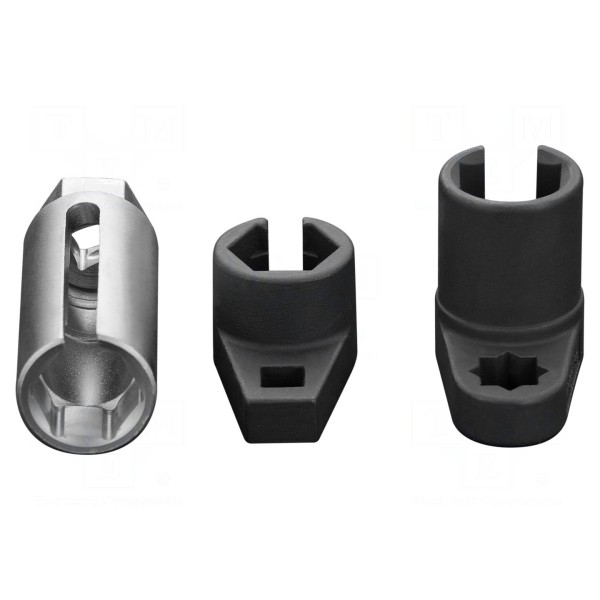 Zestaw zawiera trzy nasadki przeznaczone do demontażu oraz montażu sond lambda. Narzędzia obsługują rozmiary mocowania 1/2" oraz 3/8".