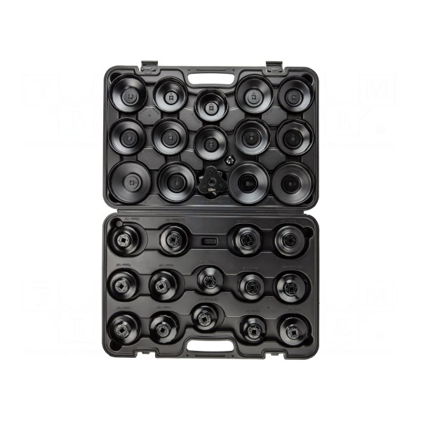 Zestaw zawiera nasadki przeznaczone do obsługi filtrów oleju. W skład kompletu wchodzi 30 elementów o różnych kształtach gniazd, obejmujących wersje 6-kątne, 8-kątne, 10-kątne, 12-kątne, 14-kątne, 15-kątne, 16-kątne, 18-kątne oraz 30-kątne.