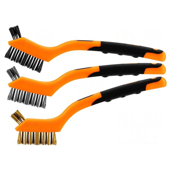 Szczotka druciana wyposażona w trzy rzędy włosia wykonanego z mosiądzu. Narzędzie posiada rękojeść z tworzywa sztucznego, która zapewnia stabilny chwyt podczas pracy.