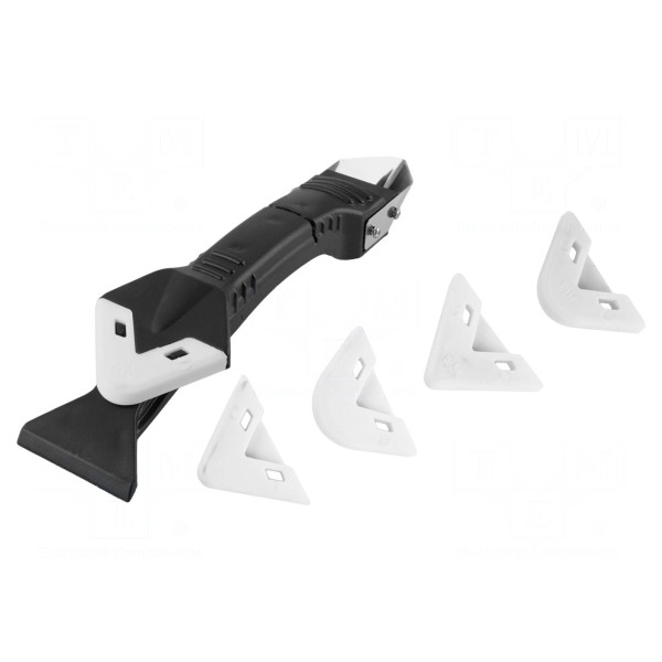 W zestawie: skrobak. Narzędzia znajdują zastosowanie przy pracach wykończeniowych z użyciem mas silikonowych.