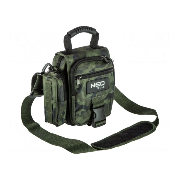 Torba narzędziowa została wykonana z poliestru 600D, co zapewnia odpowiednią wytrzymałość materiału przy przechowywaniu i transporcie wyposażenia. Produkt charakteryzuje się wzorem moro.