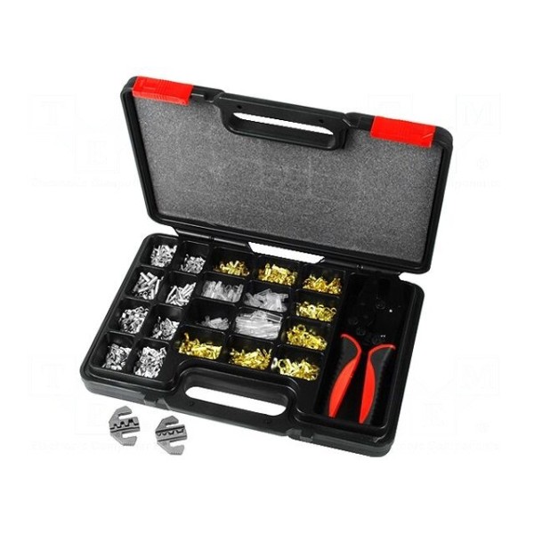 W skład zestawu wchodzą: końcówki oczkowe nieizolowane (330 szt.), końcówki widełkowe nieizolowane (140 szt.), konektory okrągłe męskie i żeńskie nieizolowane (po 70 szt.), konektory płaskie męskie i żeńskie nieizolowane (po 170 szt.), konektory płaskie nieizolowane-rozgałęźniki (40 szt.) oraz tulejki połączeniowe nieizolowane (180 szt.). Komplet uzupełniają osłony izolacyjne do konektorów okrągłych męskich (30 szt.), żeńskich (50 szt.) oraz płaskich (60 szt.).
