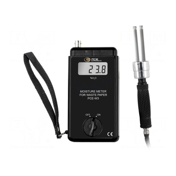 Higrometr PCE-W3 jest urządzeniem przeznaczonym do pomiaru wilgotności papieru w zakresie od 6% do 30% RH. Wyniki pomiarów prezentowane są na czytelnym wyświetlaczu LCD, zapewniającym rozdzielczość na poziomie 0,1% RH przy dokładności pomiaru wynoszącej ±10%.
