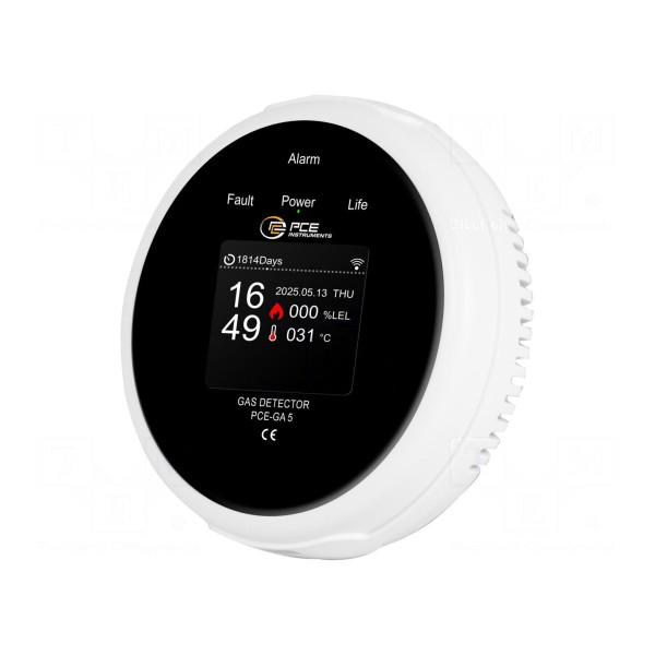 Wykrywacz gazu PCE GA5 to przenośne urządzenie przeznaczone do monitorowania stężenia tlenku węgla (CO) oraz wielu innych gazów, w tym acetaldehydu, amoniaku, benzenu, etanu, etanolu, etylenu, formaldehydu, heksanu, izobutanu, metanu, p-ksylenu, propanu, siarkowodoru, toluenu oraz wodoru. Urządzenie wyposażono w wyświetlacz LCD o przekątnej 1,7 cala, który prezentuje wyniki pomiarów w czasie rzeczywistym. Komunikację z zewnętrznymi systemami umożliwia wbudowany interfejs WLAN.