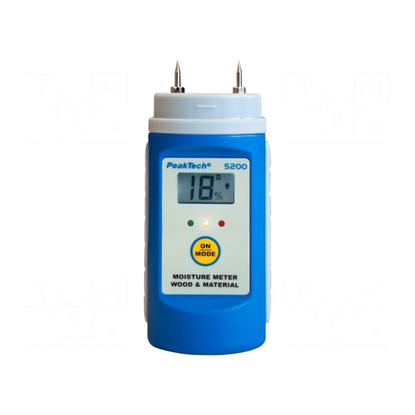 Higrometr PEAKTECH P5200 służy do pomiaru wilgotności drewna, materiałów budowlanych oraz papieru. Urządzenie oferuje zakres pomiaru wilgotności drewna od 6 do 60% RH oraz zakres dla wybranych materiałów budowlanych, takich jak zaprawa wapienna czy gips, wynoszący od 0,2 do 2,9%. Dokładność pomiaru określono na poziomie 2%.