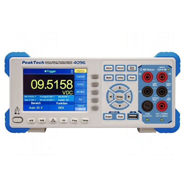 Multimetr stołowy PEAKTECH P4096 to urządzenie pomiarowe wyposażone w wyświetlacz LCD TFT o przekątnej 4 cali i rozdzielczości 480x320 pikseli. Przyrząd oferuje odczyt 5,5 cyfry (200000) i realizuje pomiar rzeczywistej wartości skutecznej True RMS. Zakres pomiarowy napięcia stałego (DC) sięga 1kV z dokładnością ±(0,0015% + 0,0005% zakresu), natomiast napięcia przemiennego (AC) do 750V. Urządzenie umożliwia także pomiar prądu DC do 10A, prądu AC do 10A, rezystancji do 100MΩ oraz pojemności do 10mF.