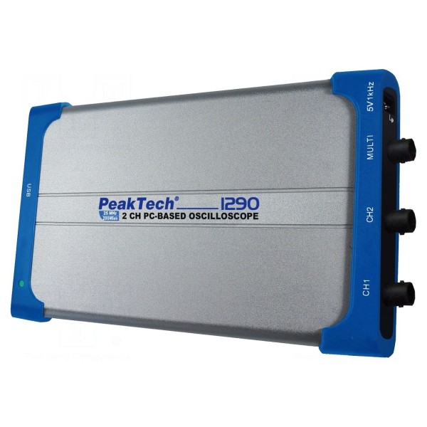 PeakTech P1290 to dwukanałowy oscyloskop podłączany do komputera przez interfejs USB, pracujący w paśmie do 25MHz. Urządzenie oferuje próbkowanie na poziomie 100Msps przy długości rekordu pamięci wynoszącej 5kpts oraz rozdzielczości przetwornika 8bit. Czas narastania sygnału wynosi ≤14ns, a czułość wejściowa jest regulowana w zakresie od 5mV/dz do 5V/dz. Sprzężenie wejścia obsługuje tryby AC, DC oraz GND, przy impedancji wejściowej 1MΩ/10pF.