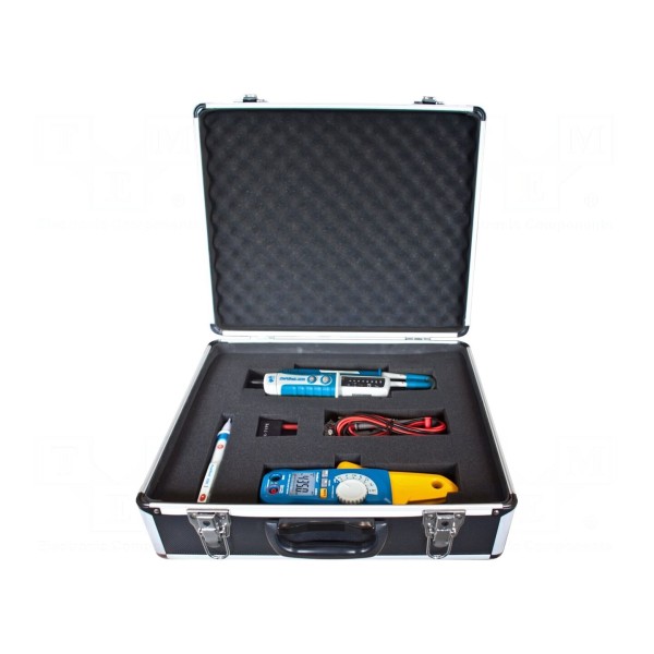 Zestaw pomiarowy P 8101 zawiera miernik cęgowy PKT-P4350 oraz dwa testery elektryczne: PKT-P1030 i PKT-P1095. Urządzenia są zasilane za pomocą sześciu baterii LR03 AAA 1,5V.