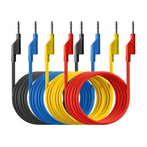 Przewody pomiarowe wyposażone w obustronne wtyki bananowe 4mm przeznaczone są do wykonywania połączeń w układach laboratoryjnych i pomiarowych. Złącza posiadają konstrukcję nieizolowaną z gniazdem osiowym 4mm, co umożliwia łatwe wpinanie w standardowe terminale. Każdy przewód charakteryzuje się długością 2 metrów, zapewniając zasięg podczas pracy z aparaturą stacjonarną.