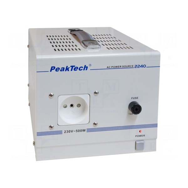 Zasilacz laboratoryjny PeakTech P2240 jest urządzeniem jednokanałowym przeznaczonym do pracy z napięciem przemiennym. Jednostka dostarcza napięcie wyjściowe 230V AC przy maksymalnym prądzie wyjściowym 2,5A oraz mocy wyjściowej sięgającej 500W. Urządzenie pracuje w zakresie częstotliwości od 50Hz do 60Hz.