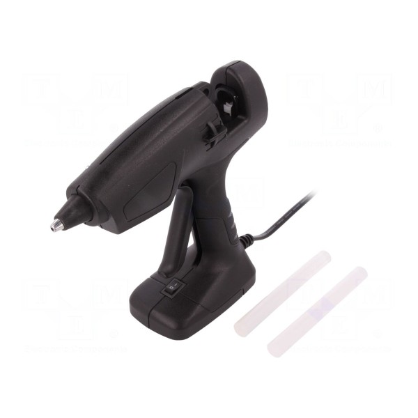 Pistolet posiada przewód zasilający o długości 1,8m ze złączem w standardzie europejskim. W zestawie: sztyfty klejowe x2.