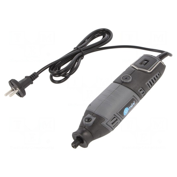 Sprzęt przystosowany jest do pracy z wiertłami o średnicy od 0,4 do 3,2mm. Całkowita długość przewodu zasilającego wynosi 1,7m, co wpływa na swobodę manewrowania podczas wykonywania prac wiertarskich. W zestawie: 3 wymienne tulejki zaciskowe.
