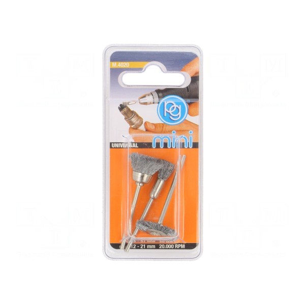 Zestaw szczotek PG MINI M.4020 składa się z trzech elementów wykonanych ze stali. Akcesoria przeznaczone są do elektronarzędzi i posiadają średnicę trzpienia wynoszącą 2,35mm.