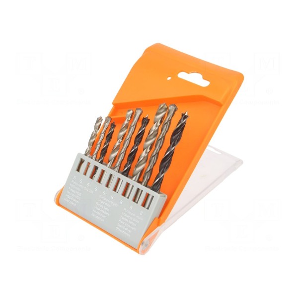 Zestaw zawiera dziewięć wierteł przeznaczonych do pracy w różnych materiałach, takich jak beton, drewno oraz stal. Narzędzia wykonane zostały ze stali i obejmują wiertła o średnicach 5 mm, 6 mm oraz 8 mm.