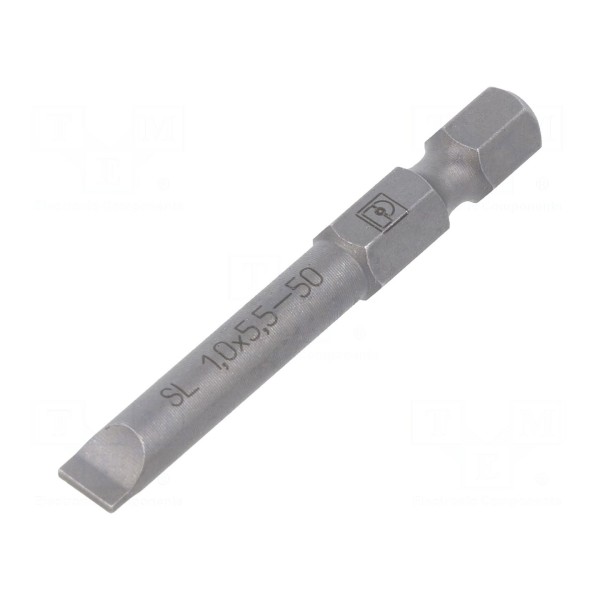 Końcówka wkrętakowa typu płaskiego przeznaczona jest do prac montażowych. Element charakteryzuje się rozmiarem grota wynoszącym 5,5x1 mm oraz długością całkowitą 50 mm.
