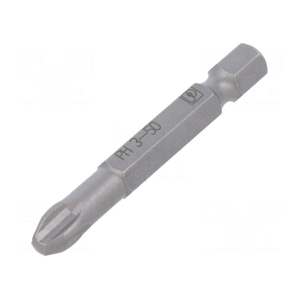 Końcówka wkrętakowa typu Phillips o rozmiarze grota PH3 przeznaczona jest do współpracy z uchwytami o gnieździe 1/4" oraz standardzie mocowania E6,3mm. Narzędzie charakteryzuje się długością całkowitą wynoszącą 50mm. Produkt znajduje zastosowanie w pracach montażowych wymagających użycia wkrętaków z odpowiednim typem końcówki. Konstrukcja elementu zapewnia stabilne osadzenie w uchwycie narzędziowym.