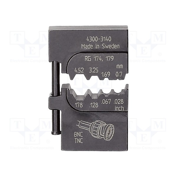 Produkt stanowi wymienne szczęki przeznaczone do zaciskania złączy typu BNC oraz TNC. Element ten został zaprojektowany w celu rozszerzenia funkcjonalności narzędzi do obróbki końcówek przewodów.