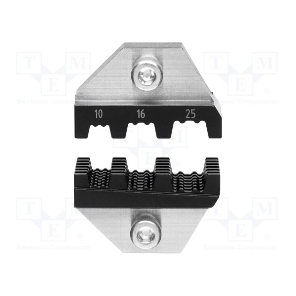 Prezentowane szczęki do zaciskania są elementem wymiennym przeznaczonym do wykorzystania w procesach montażowych. Konstrukcja komponentu umożliwia obsługę przewodów o przekrojach 10mm², 16mm² oraz 25mm².