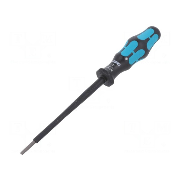 Wkrętak płaski typu izolowanego przeznaczony jest do prac z elementami pod napięciem. Rozmiar grota wynosi 3x0,5mm, a długość samego ostrza to 100mm.