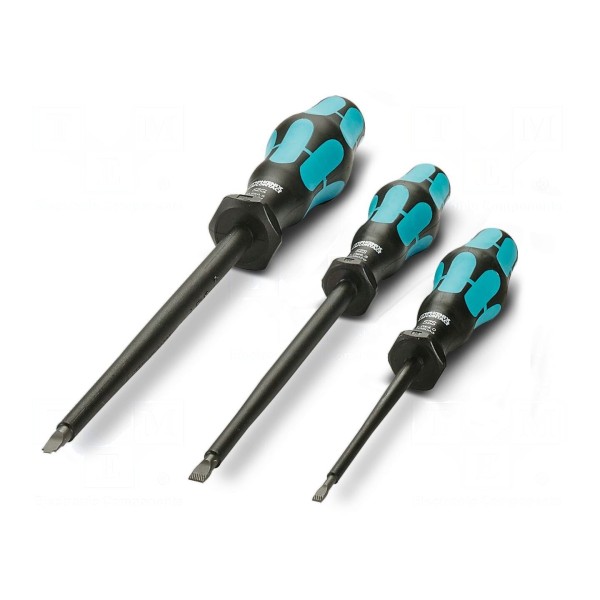 Zestaw zawiera trzy izolowane wkrętaki z grotem płaskim, przeznaczone do prac przy instalacjach elektrycznych. Narzędzia charakteryzują się konstrukcją przystosowaną do pracy pod napięciem, zapewniając odpowiedni poziom ochrony użytkownika.