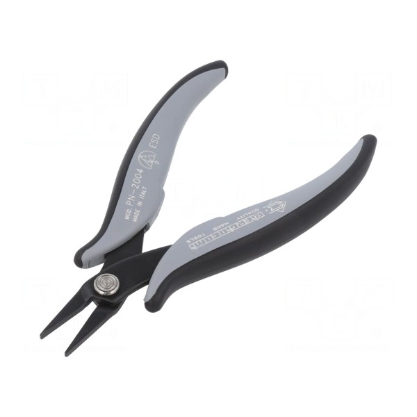 Szczypce PN 2004 D to narzędzie przeznaczone do precyzyjnego chwytania oraz gięcia elementów. Konstrukcja charakteryzuje się płaskimi, gładkimi powierzchniami chwytającymi, co pozwala na bezpieczną manipulację delikatnymi komponentami bez ryzyka ich uszkodzenia czy zarysowania.