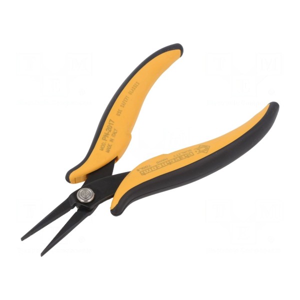 Szczypce PIERGIACOMI PN 2017 to narzędzie płaskie, przeznaczone do precyzyjnego chwytania oraz gięcia elementów. Konstrukcja szczypiec charakteryzuje się wydłużonym kształtem, co ułatwia dostęp do trudno dostępnych miejsc w pracach montażowych i serwisowych.