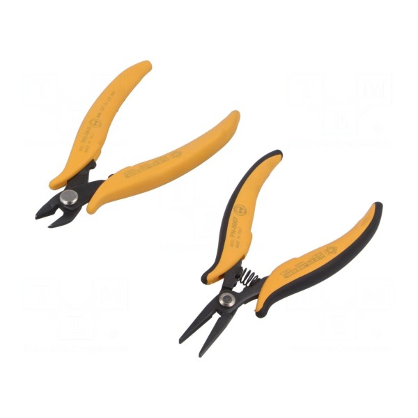 Zestaw zawiera dwa rodzaje szczypiec przeznaczonych do prac montażowych i serwisowych. W skład kompletu wchodzą szczypce do chwytania oraz szczypce do cięcia bocznego, które umożliwiają obsługę drobnych elementów oraz cięcie przewodów.