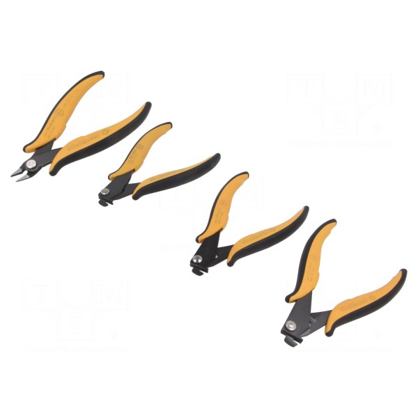 Zestaw składa się z czterech sztuk szczypiec przeznaczonych do prac montażowych. Narzędzia dostarczane są w etui, które ułatwia przechowywanie oraz transport całego kompletu.