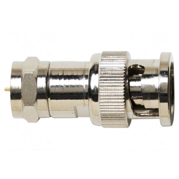 Adapter jest przeznaczony do połączeń w układach sygnałowych, oferując przejście między złączem BNC męskim a wtykiem typu F. Konstrukcja elementu zapewnia impedancję znamionową na poziomie 75Ω.