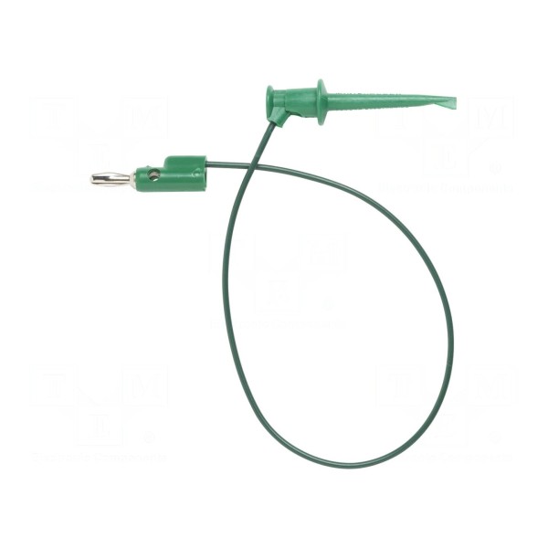 Przewód pomiarowy o długości 1,219 m został wyposażony w chwytak haczykowy oraz wtyk bananowy 4 mm. Konstrukcja umożliwia łączenie typu sztaplowanego, co ułatwia organizację połączeń w układach pomiarowych. Przewód posiada zielony kolor izolacji wykonanej z poliamidu.